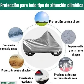 - Actúa como un escudo protector para tu motocicleta. Su estructura de 9 capas de polietileno de alta densidad crea una barrera impenetrable contra agua, rayos UV, polvo y contaminantes ambientales. La superficie plateada reflectiva actúa como espejo frente a los rayos solares, reduciendo significativamente la temperatura de la moto y previniendo el deterioro de pintura y componentes. Además, su diseño universal se adapta a diferentes tipos de motocicletas, asegurando una cobertura completa y ajuste seguro.